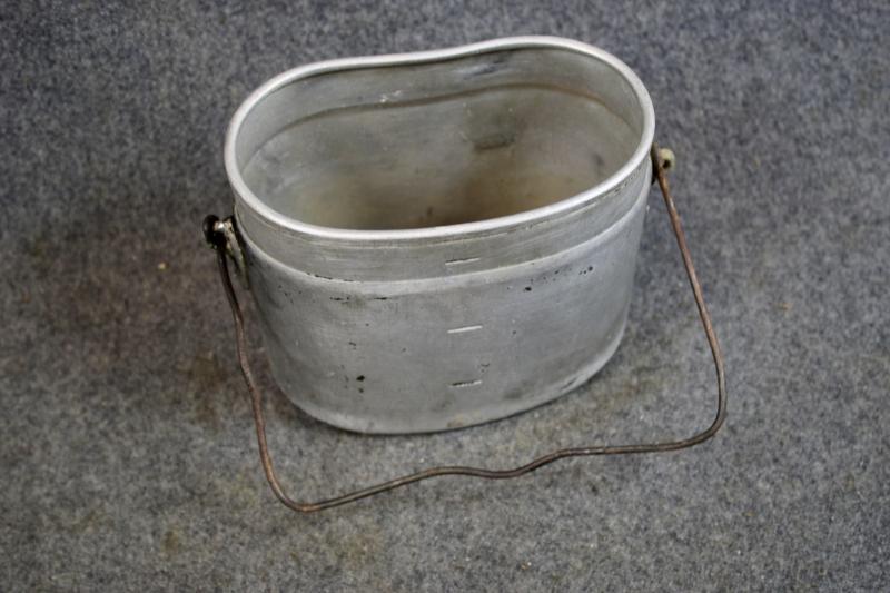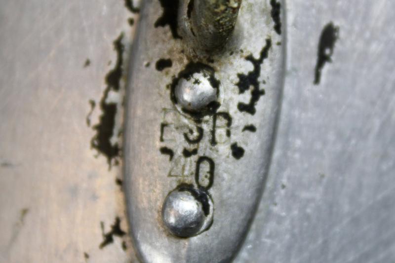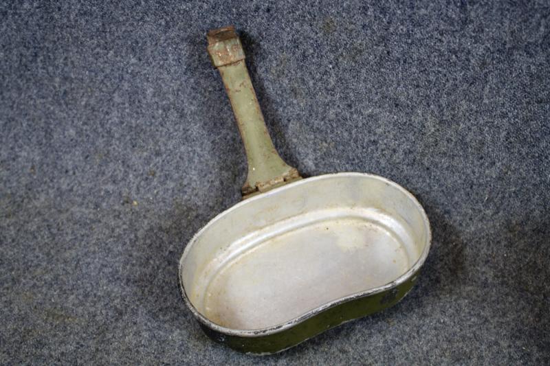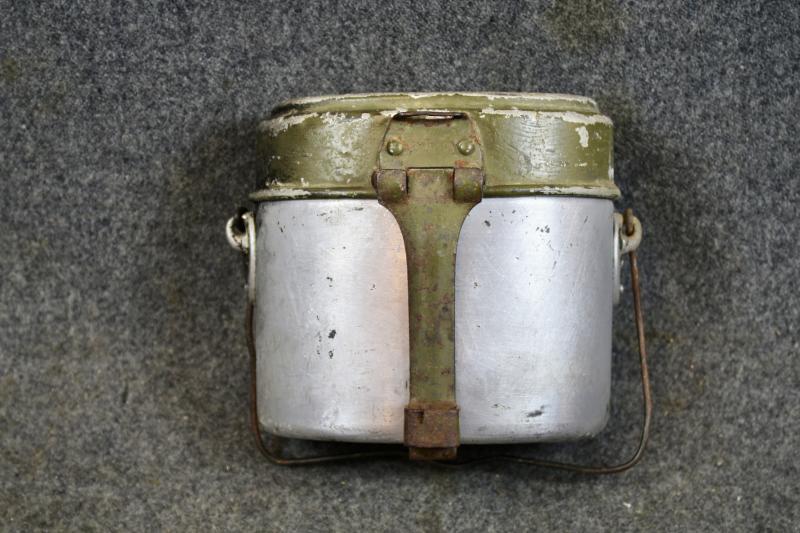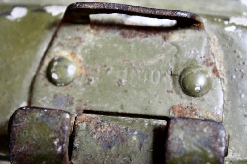 A set of matching M31 mess tins which the upper and lower parts are both maker marked 'ESB" and dated 1940. The upper part retains most of its green finish were the lower half has lost all its paint.