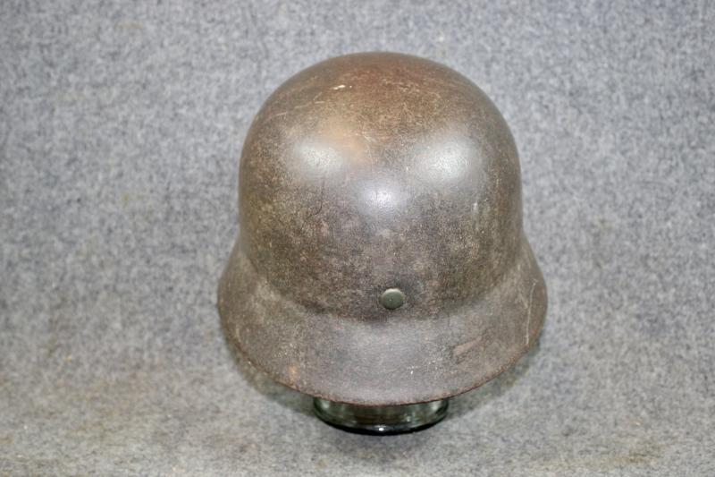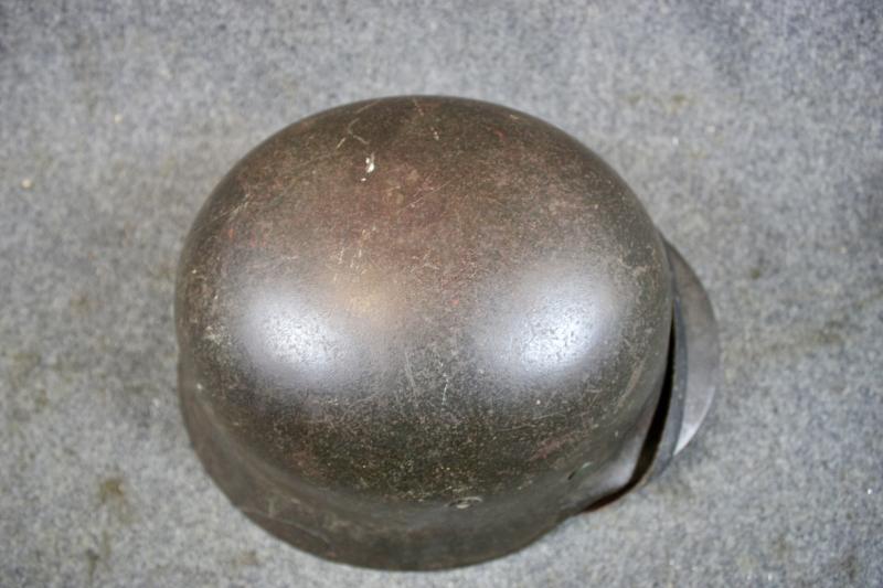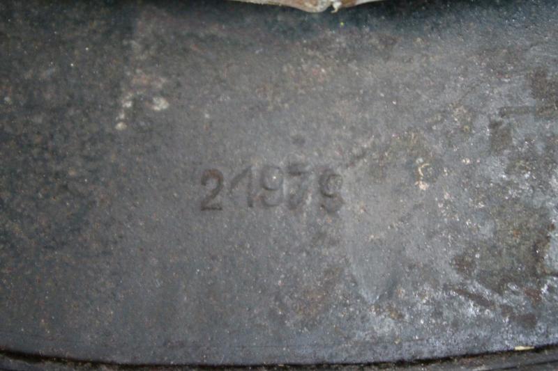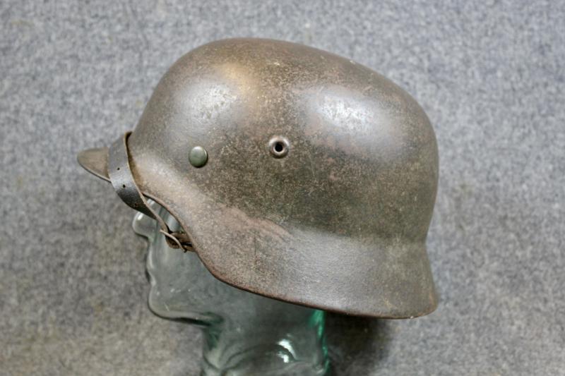 A nice untouched M40 helmet which has the batch number 21979 and the maker's code EF for Emailerwerke AG. The shell size is 66. The liner and chinstrap are both in excellent condition with the chinstrap maker marked and dated 1941.