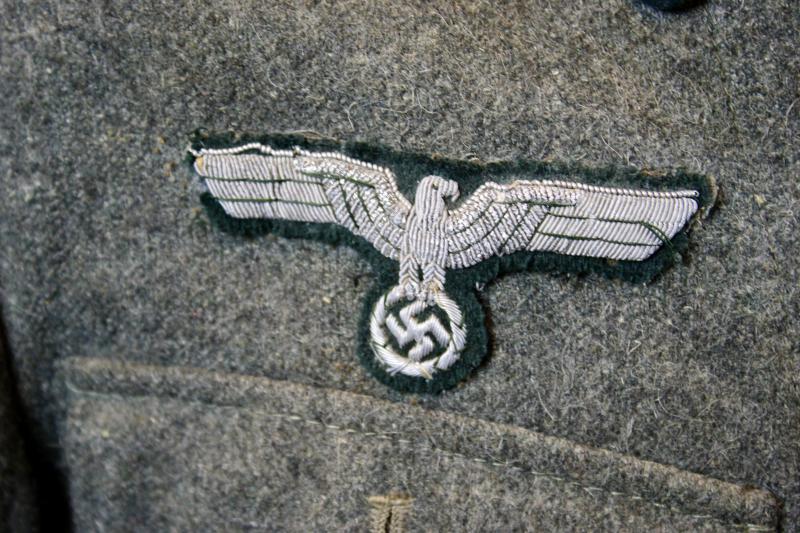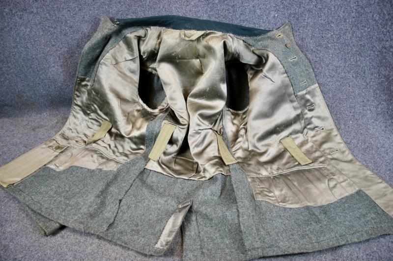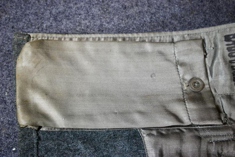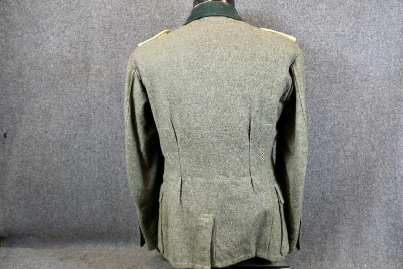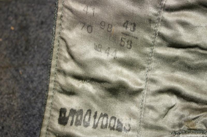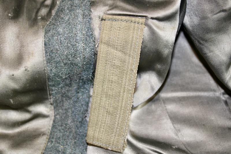 This in in fact a standard enlisted man's M43 tunic, which the officer wood have drawn form the stores. The collar has been replaced with a green collar and no other alterations has been done to the tunic, apart of the addition of officer insignia, breast eagle, collar tabs and shoulder boards. The collar tabs and shoulder boards have the branch of service piping white for infantry and the rank of Hauptmann ( Captain ). The collar has suffered with some moth damage especially around the collar tabs and the front of the tunic on the left side has also suffered with some minor moth nips. The rayon lining still clearing shows the size markings and the date of production 1944 ( R44 ).