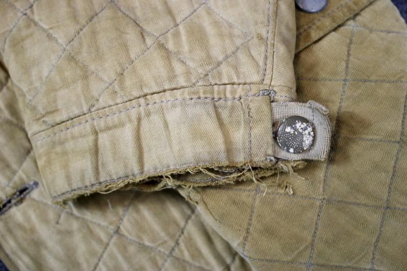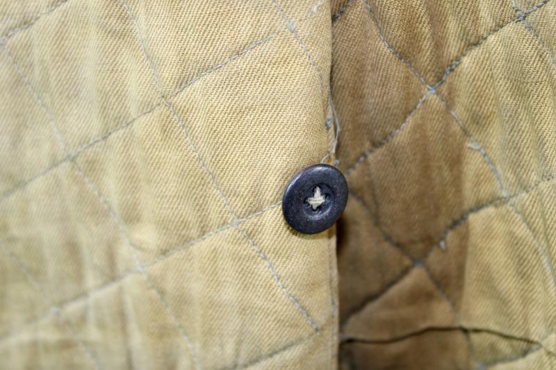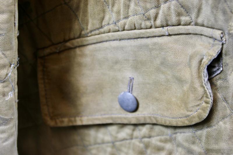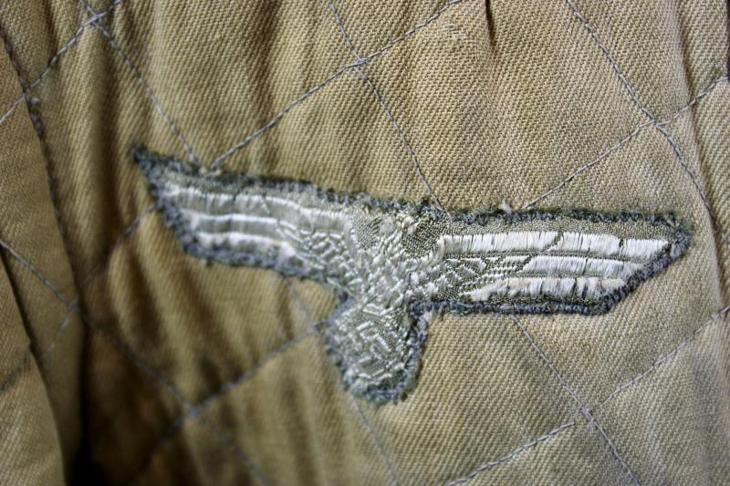 This is a non reversible quilted winter parka which has had a army breast eagle applied, which appears to be a period application. The parka is in very good condition with a rayon hood and frontal button flap. The draw-cord for the hood has been pulled out and is missing. Besides the missing draw-cord the parka is in very good condition.