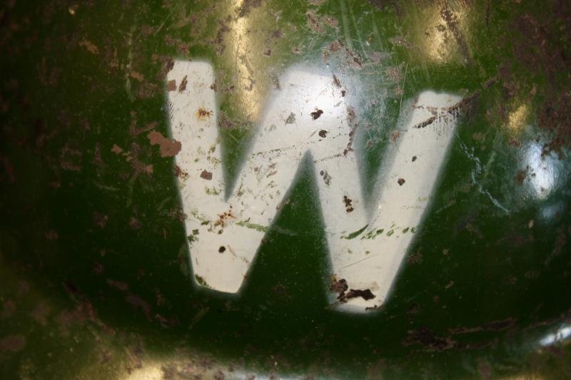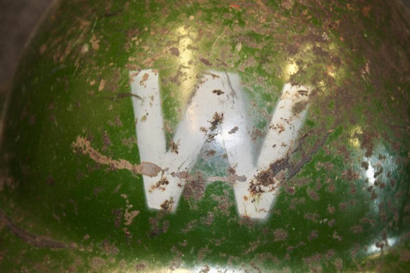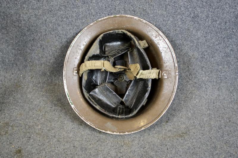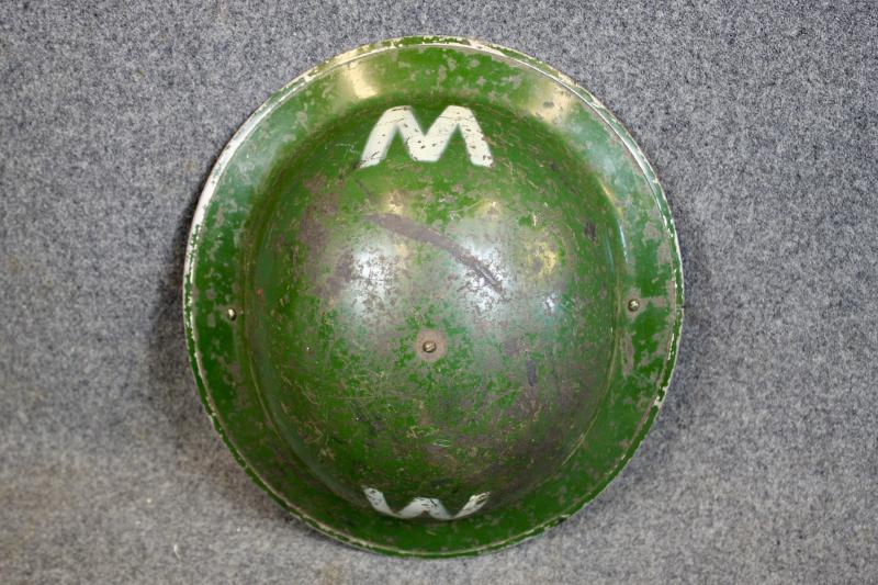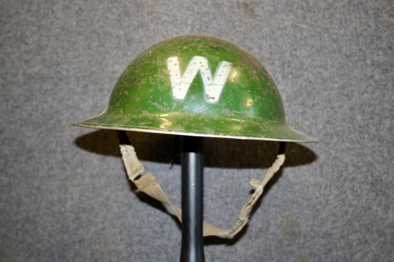 This is a British made MKII helmet, which supplied to the Republic of Ireland, which received over 60,000 helmets by the United kingdom during WW2 with a large number being supply to the Irish Civil Defence, which mirror its British counterpart. The Irish Civil Defence helmets where overpainted to reflect the branch of service. Red for fire, blue for rescue, white for casualty service, green for air raid wardens and police. This example is an air raid wardens helmet with the original British army khaki finish still visible on the inside of the shell. The liner is maker marked TTC for Teddy Toy Company, which produced liners from 1939 to 1942. It's size stamped 7.1/4 and dated 1940.