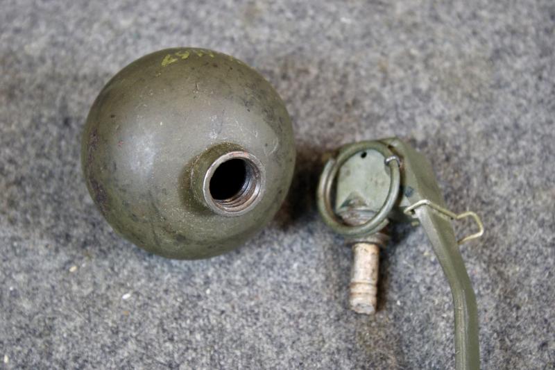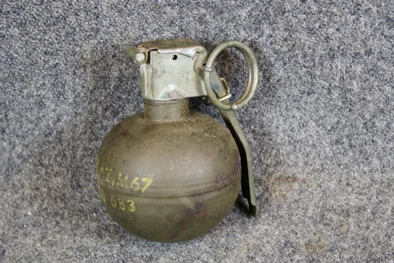The M67 grenade was first introduced in 1968 and is more commonly known as the 'Baseball grenade" due to its shape. This example is in excellent condition with the body dated December 1973, the fuse is dated February 1973 and the container dated September 1973. The grenade still retains its safety clip. U.K. Sales Only.