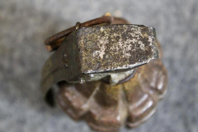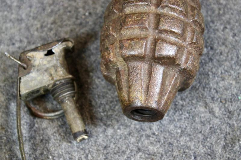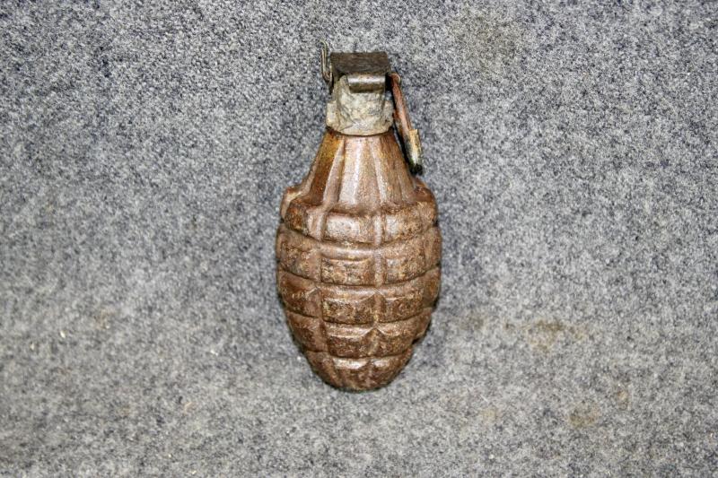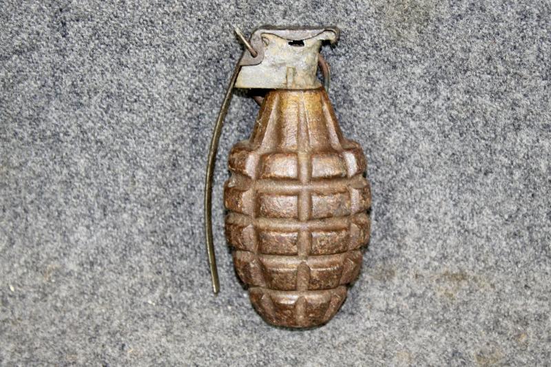 This is a pre-1942 made MKIIA1 fragmentation grenade, more commonly known as the "Pineapple Grenade" due to its resemblance to the said fruit. Early manufactured MKIIA1 grenades where paint yellow to mid 1942, with all grenades manufactured after 1942 where painted olive drab. However the majority of early grenades where overpainted leaving a yellow band at the top of the grenades body. This example has traces of its original yellow and post-1942 over paint finish. It is maker marked "S" for Stewart-Warner Speedometer Company. U.K. Sales Only