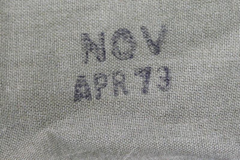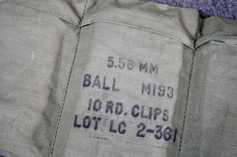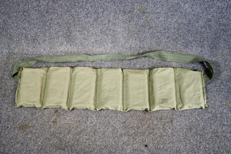 This is ammunition bandolier which could hold fourteen 10 round clips or seven 20 round magazines for the M16 assault rifle. This example is maker marked 'NOV" and dated April 1973. It comes with seven dummy M16