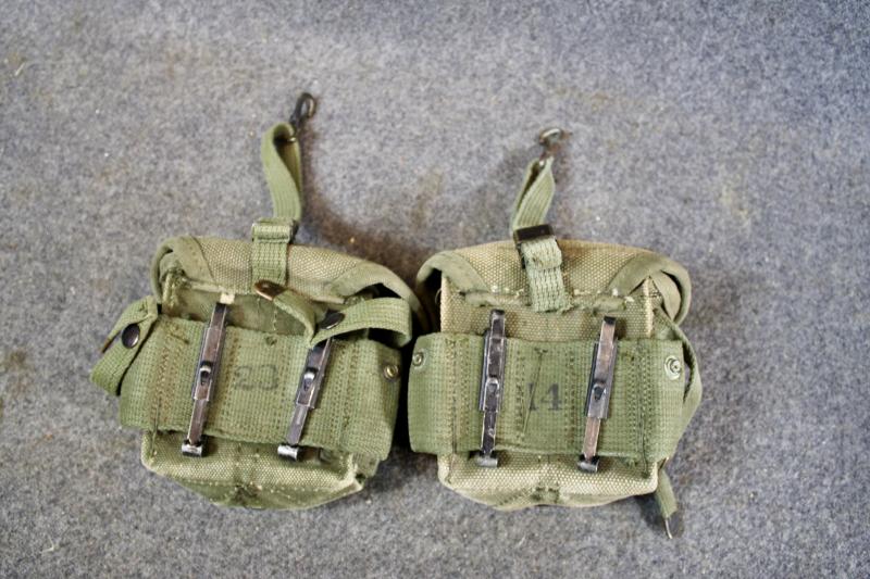 A set of rare M1956 short magazine pouches for the M16 assault rifle. Each pouch could hold two 20 round magazies. Both pouches are dated 1968. ( 68C ) and are DSA ( Defence Supply Agency ) marked.