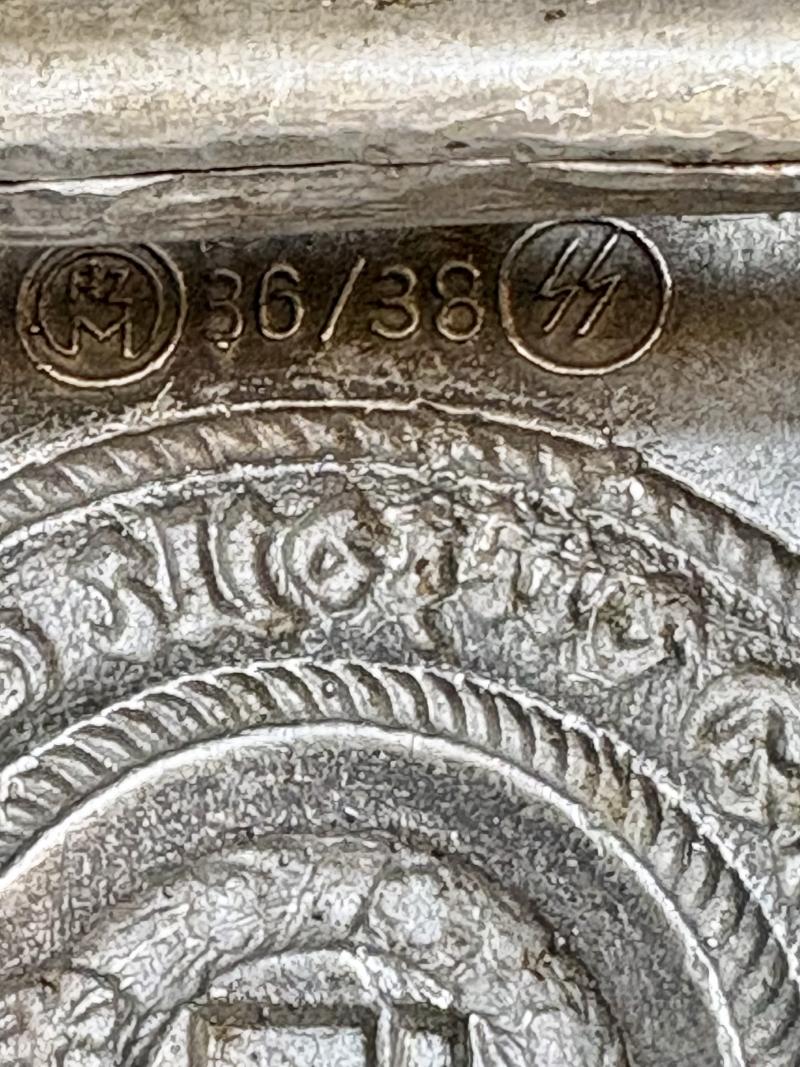 This is a aluminium Waffen-SS buckle which has the makers code 36 for Berg & Nolte AG and dated 1938. The buckle comes with a leather belt which appears to have been used as a souvenir item. It was common practice for allied soldiers to pin German badges to captured belt leathers, which i believe was the case with this example. Otherwise the belt leather is in very good condition and size stamped 92.