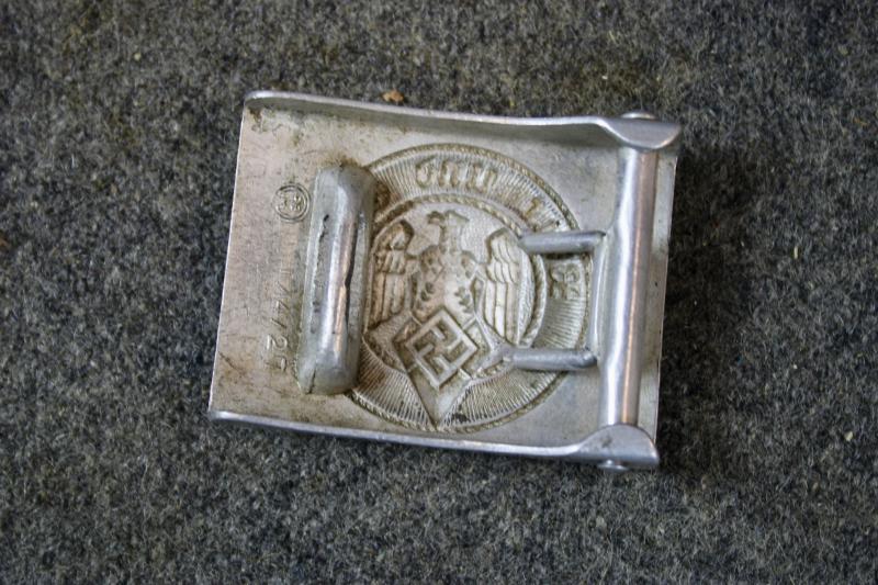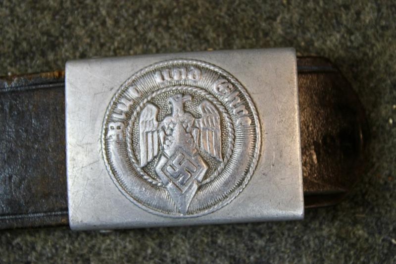 A aluminium Hitler Youth buckle, which comes with its leather belt. The buckle is maker marked M4/27 for Overhoff & Cie. The belt leather measures 33 inches.