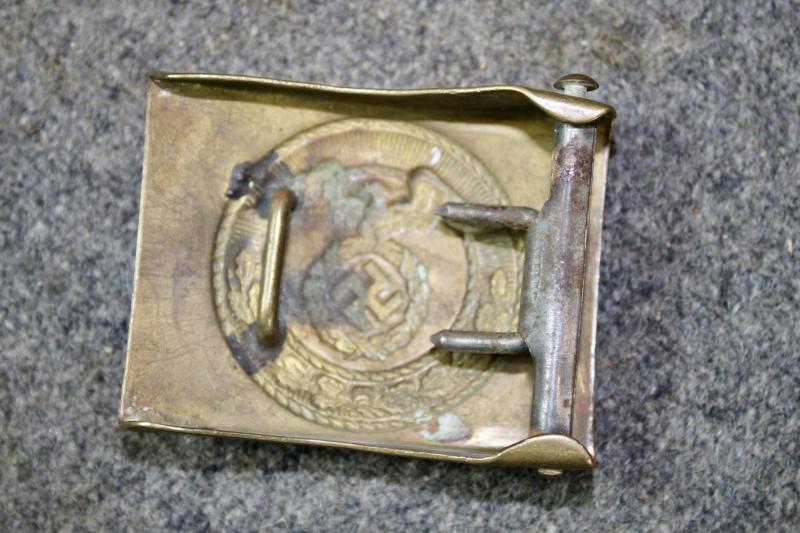 This is a good example of a 2nd pattern SA ( Sturm-abteilung ) brass buckle which was introduced in 1935. This example comes with a brown leather belt approximately measures 35 inches.