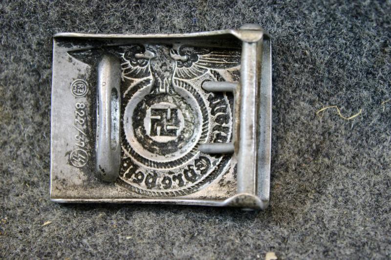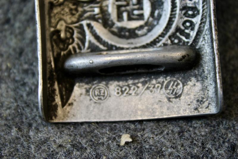 Aluminium Waffen-SS belt buckle which is in good condition and has the makers code "822" for Franz Stark & Sohne. This example is dated 1937.