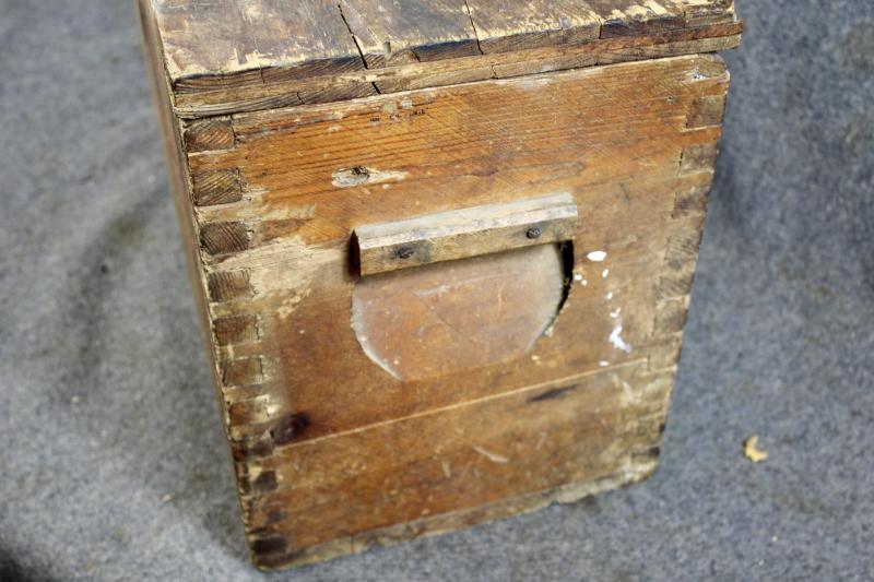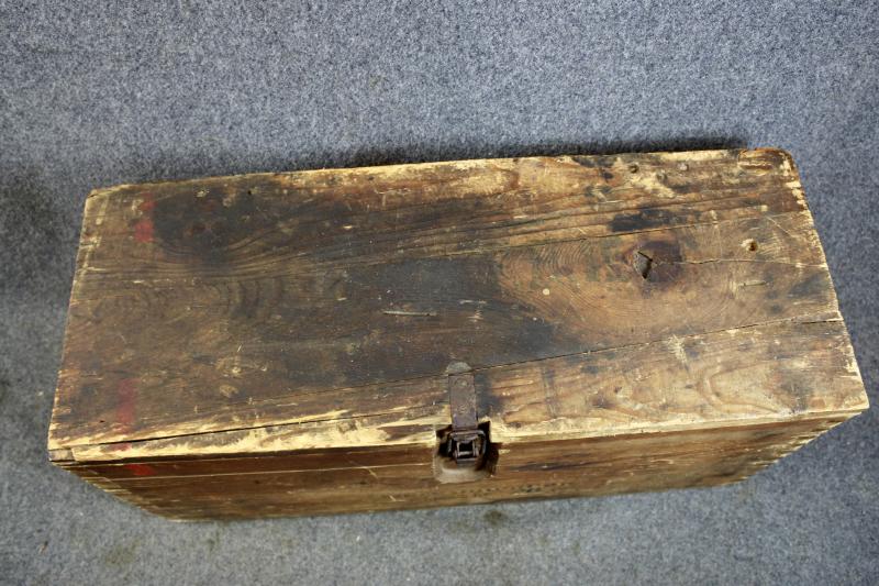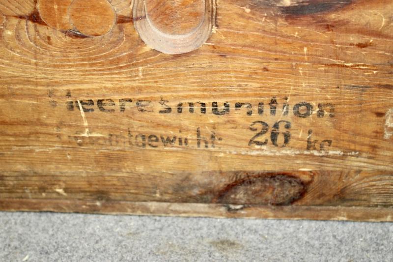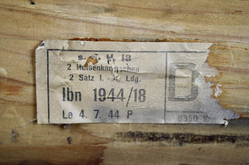 This is a wooden munition box which is stamped "HEERES MUNITIONS" ( Army Munitions ). for the S.FH.18 field Howitzer This example retains its paper label which is dated 1944.