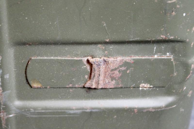 This is a M1924 stick grenade box, which has been repainted. However the colour is a perfect match to the original colour. This example is missing its strap retaining loops, There is a visible three letter makers code "brb" for Richard Rinker GmbH. It is also stamped with a Third Reich proof markings ( Waffenampt ).