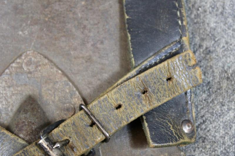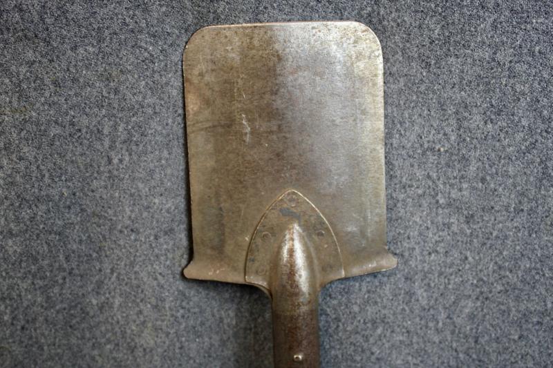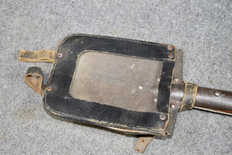 An early type straight entrenching tool which is maker marked and comes with the leather carrier with two belt loops. The end of the securing strap has been cut but still secures the entrenching tool to the carrier.
