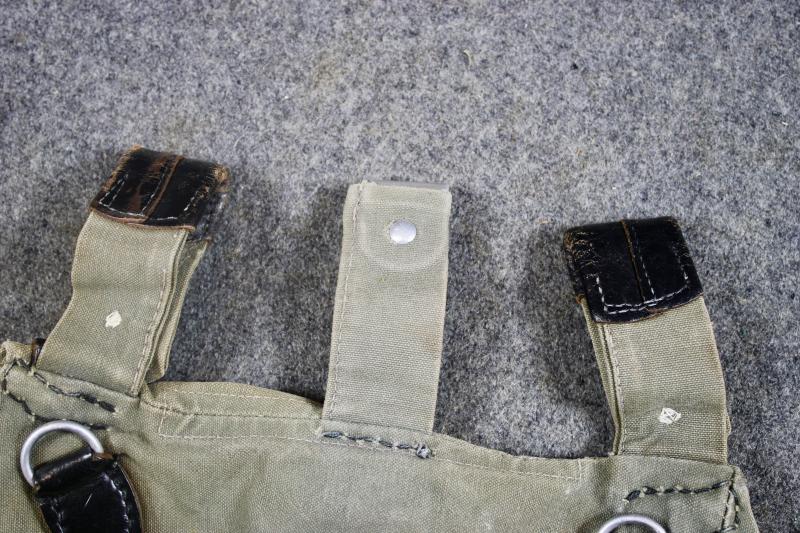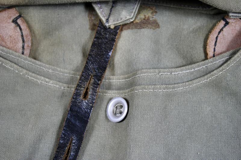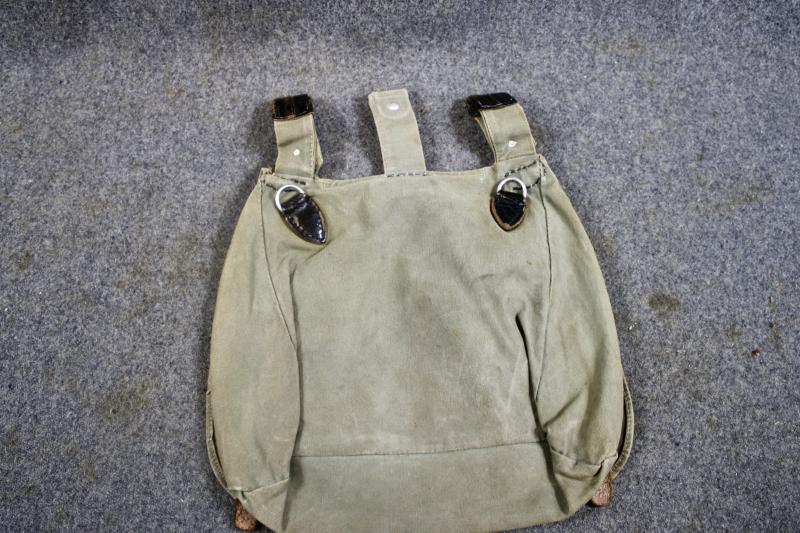 This is a mid-war made M31 bread bag with leather re-enforcements and a split compartment. This example is in very good condition.