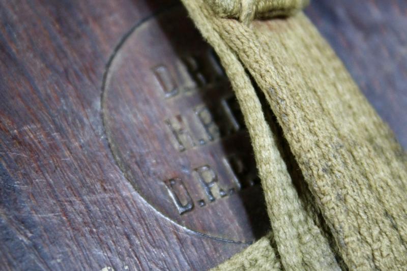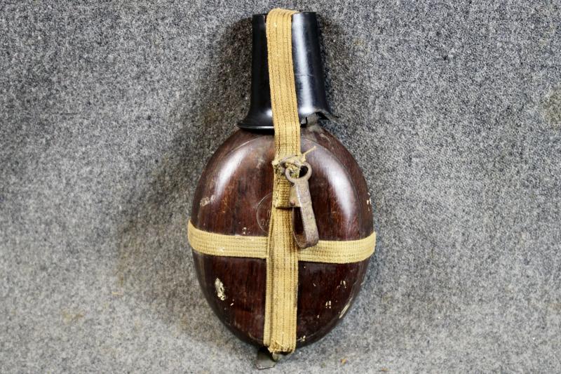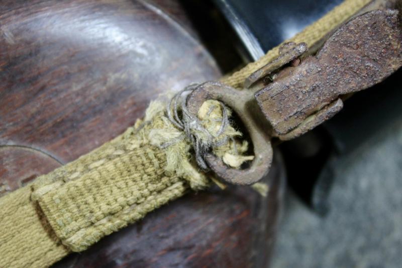This is a 1942 dated tropical issue water bottle, which has specks of white paint. The carrying harness has suffered with some damage. The bread bag clip has come away, however this has been stitched back. The bakelite cup has a piece missing from its outer edge. Still ideal for display.