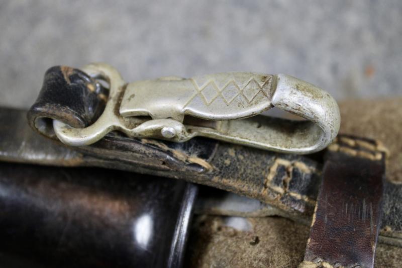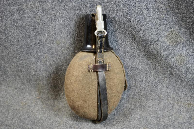 This is a M31 water bottle which is dated 1942 maker marked GNL and has a 1933 dated cap, which retains its rubber seal and is maker marked WAL. This example comes with a black bakelite cup. The felt cover has a moth hole just by the leather harness loop.