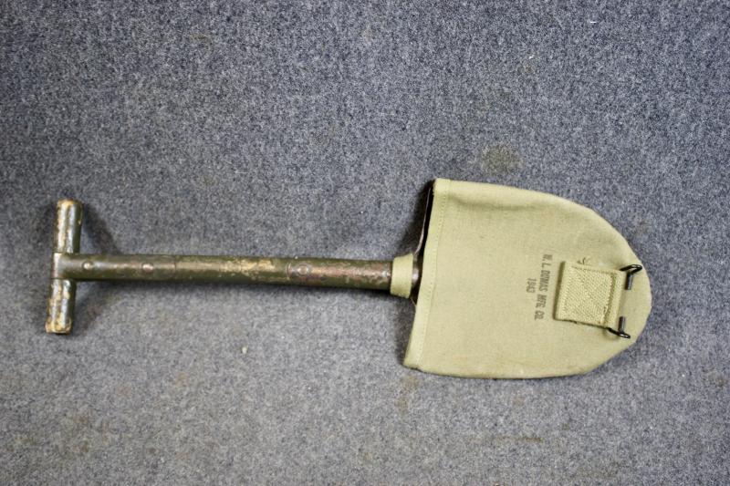 This is a M1910 intrenching tool which comes with a mint example of a M1928 carrier, which is maker marked W.L.DUMAS MFG.Co and dated 1943