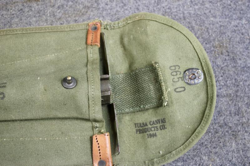 This is a M1943 folding entrenching tool, which comes with the 2nd pattern carrier is maker marked Tulsa Canvas Products Co and dated 1944. It is also marked with the original owners personal service number.
