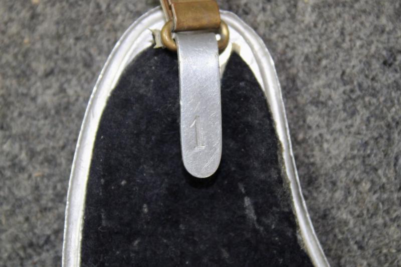 This is a type 1 Standard bearers gorget which would have been worn by a member of the Deutscher Reichkriegerbund ( German National Veteran League ). This example has had a minor repair to the right stud which connects the brass chain where the fitting appears to have broke off. Besides the repair it is in good condition and has the makers code 1 for Deschler & Sohn.