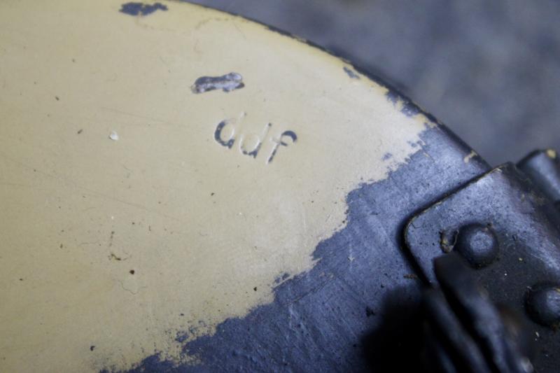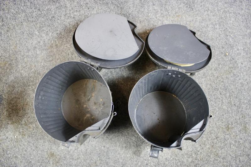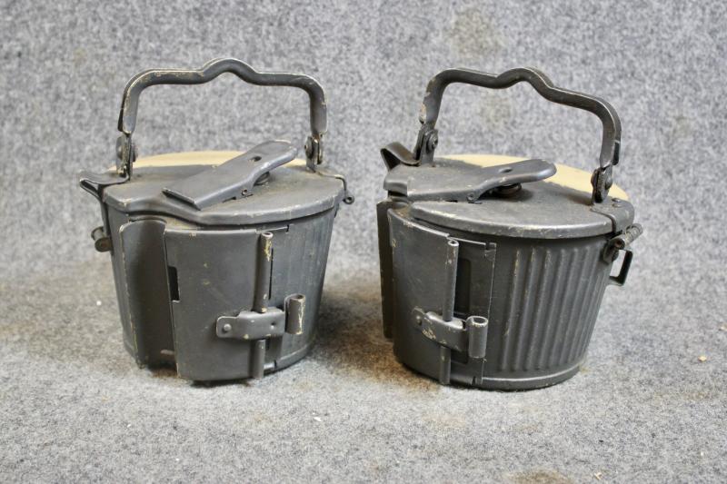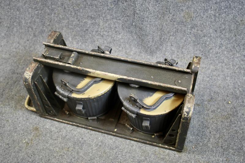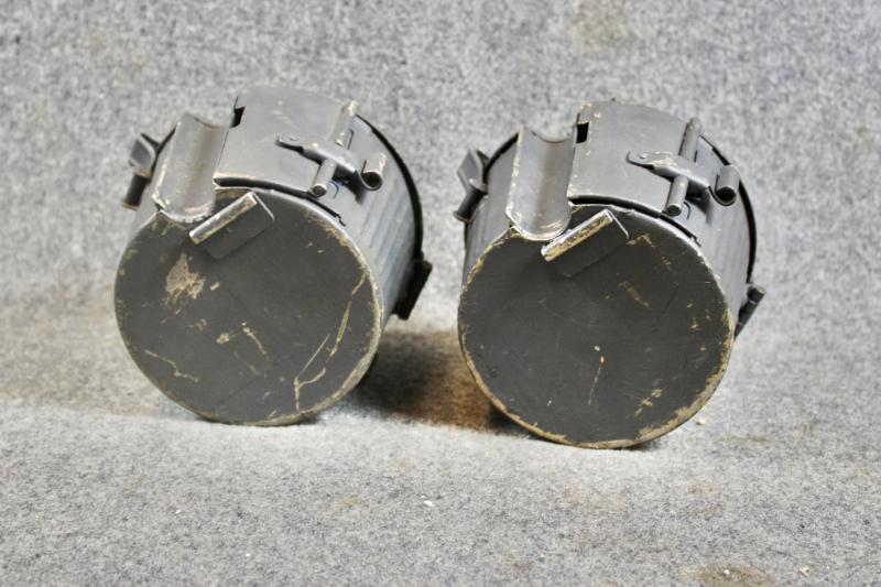 Two MG42/34 fifty round assault drum magazines with their carriyng rack. The drum magazines where originally paint ordnance tan and have been overpainted in steel grey. One of the magazines is marked with the three letter makers code "ddf" for Lohmann-Werke AG. The other drum magazine has no makers mark and may be a Yugoslavian post-war made copy. The rack is in very good condition and has also been period over painted with traces of the original ordnance tan visible. It is also maker marked with the manufacturers two letter code "wa" for Hugo Schneider AG and dated 1943.