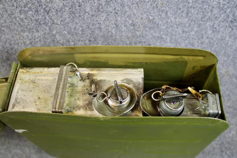 This is an ammunition tin with oil and petrol tins included. It would normally have three types of tin, unfortunately one is missing.
