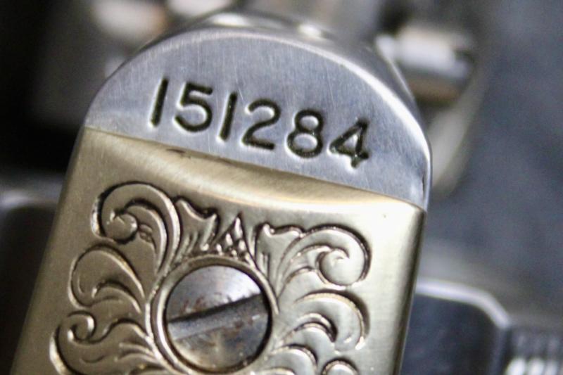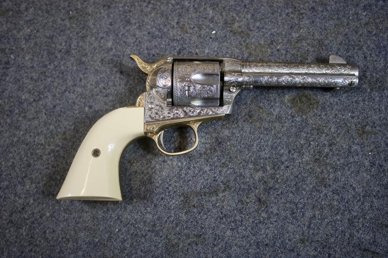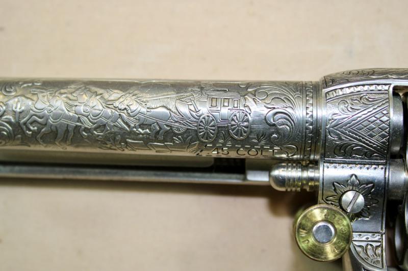 This is an exact replica of the M1871 single action revolver produced by Colt for John Wayne to commemorate his contribution to the Western films. It is exact in every detail. The body is nickel plated and extensively engraved with gold plating and bears the same serial number of the real revolver "151284. John Wayne's signature is engraved on the grip strap. The grips have a slight stained appearance which was actually soaked by John Wayne himself on the real revolver to create a stained look. The barrel also has an engraving of a stage coach which was the name of the film which propelled John Wayne to Hollywood stardom. The cylinder will not load any rounds, however it does have a full working action. It was first made available in to buy in 1992 for $450 ( £260 ) with a later version produced in 2007. However the later version does not have John Wayne's signature on the back of the grip strap, or the wall hanger. Sold subject to the Violent Crimes Reduction Bill. U.K. Sales Only