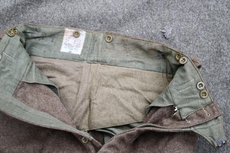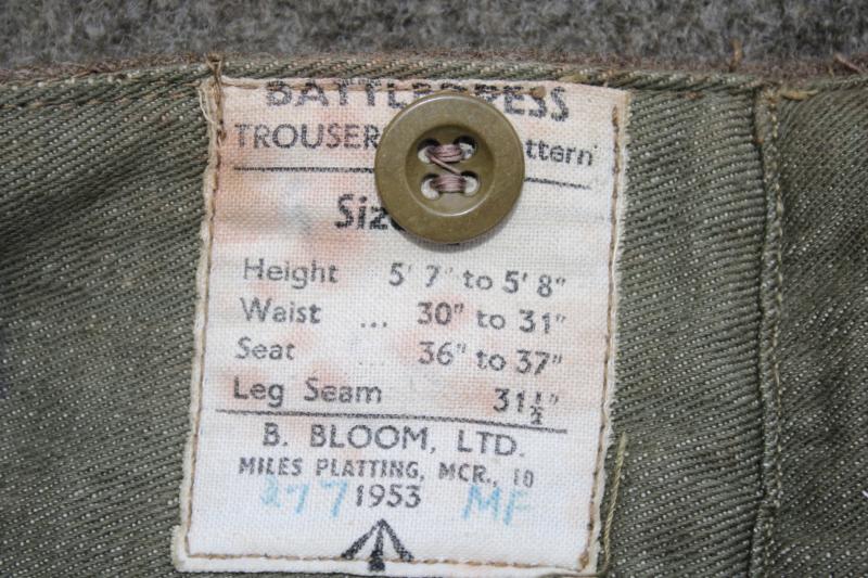 49 pattern Battle Dress trousers which are in good condition and retain their contract label. Which gives the manufacturers name B.Bloom LTD, the size, which is size 7 and the date of manufacture 1953.