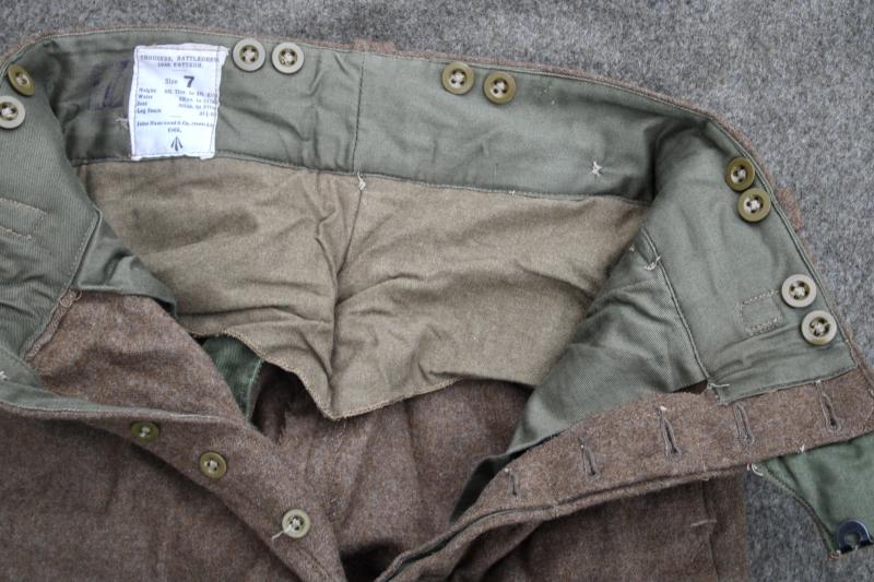 49 pattern Battle Dress trousers, which retain their contract label which gives the manufacturers name, John Hammond LTD, the size, which is size 7 and the date of manufacture 1955. This example has suffered with some very minor moth nips.