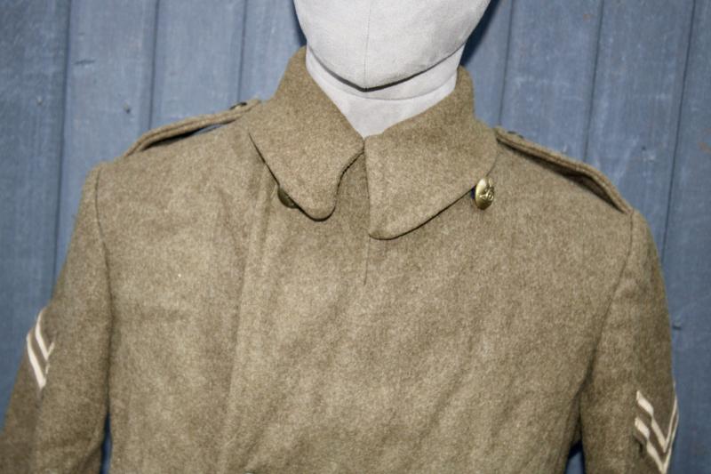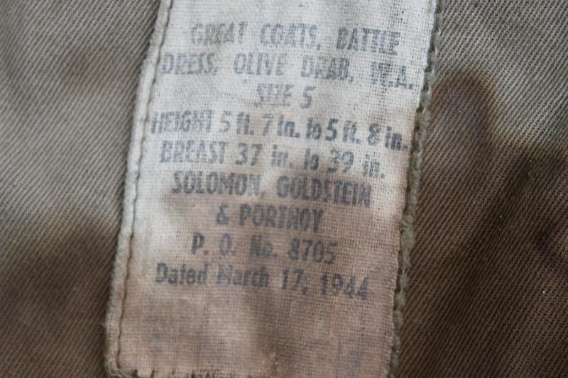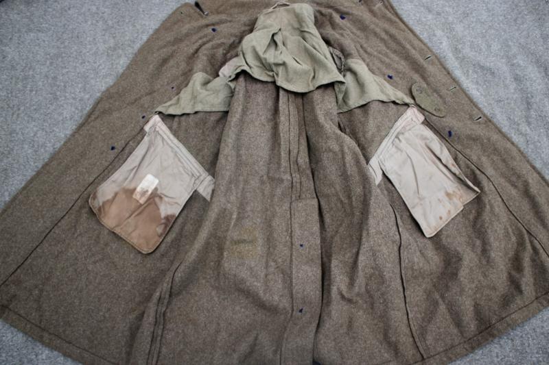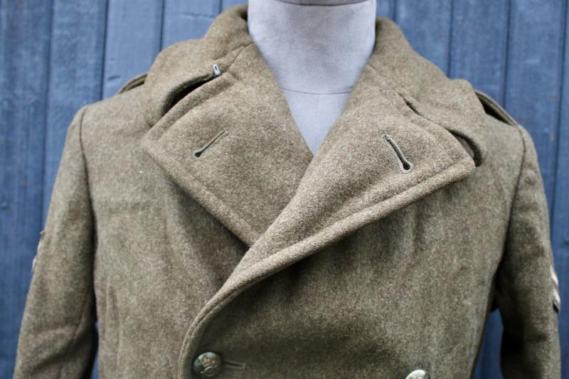 This is a 1941 pattern great coat, which differs from the 39 pattern great coat, buy the addition of a invert pleat to the back and the length of the coat was decreased by 2 inches and the fall of the collar by 3/4 inch. This example is in very good condition. However it has suffered what looks like coffee stains to the pocket lining. The coat has brass buttons of the Royal Artillery and the rank of corporal. The coat also retains contract label, which gives the manufacturers name Soloman, Goldstein, the size, which is size 5 and the date of manufacture 17th March 1944.