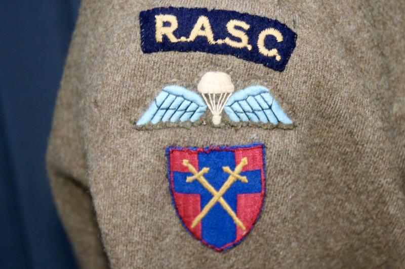 This is a very nice example of a private purchase officers 37 pattern Battle Dress with the rank of Lieutenant of the Royal Army Service Corps ( RASC ) belonging to the 21st Army group, which is a post-war badge of the British army over the Rhine ( BAOR ). The BD also has a paratroopers jump qualification wings. The BD also retains the tailors label, which gives the name of the tailer as Hawkes & Co. LTD at Savile Row London.