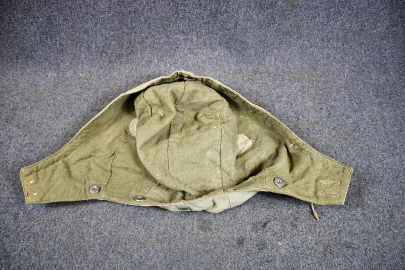 This is a detachable hood for the tankers suit, which is sometimes referred to as the "Pixie Suit". This example is actually post-war manufacturer, however it is identical to the wartime examples except for the chromed press-studs. Wartime examples are made of brass.