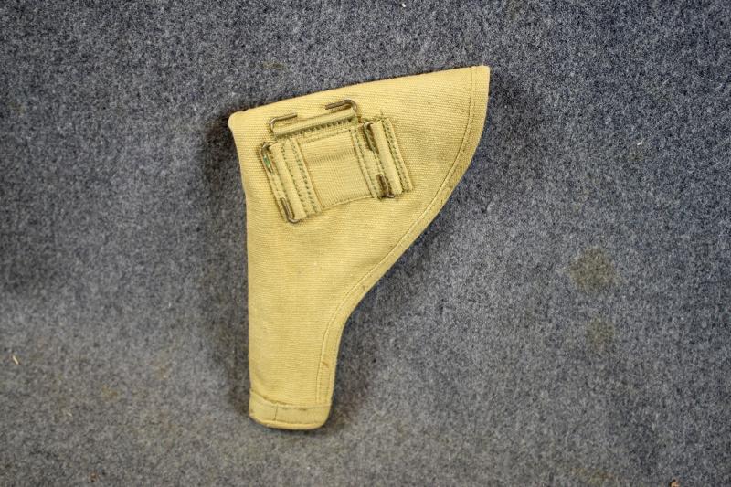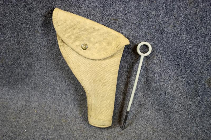 This is webbing holster originally designed for use with the MKVI .455 revolver. However it was also used for the .38 Revolvers such as the Webley MKIV, Enfield No2 MK1 and the Smith & Wesson Victory revolvers. This example is dated 1942 and has a faint makers marking and comes with a cleaning rod which is plastic coated.