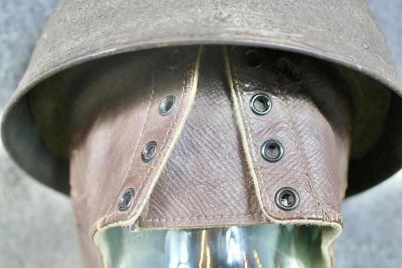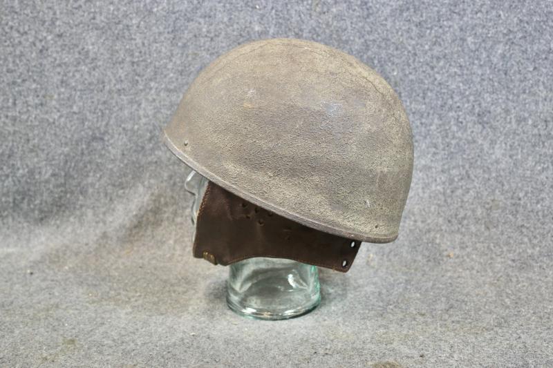 This is a 1944 dated despatch riders helmet, retaining most of its original finish. The liner is in good condition however the chinstrap has been cut to a shorter length and the the lace is missing from the back to either reduce the enlarge the liners fit. The liner is also maker marked "BMB" for Briggs Motor Bodies and is size stamped 6.1/2. However the internal ear flaps have worn away.