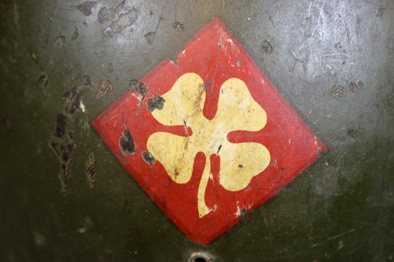 This is an M1 Fixed bale front seamed M1 helmet which would have been produced between July 1941 to October 1943. This example is in very good condition retaining nearly all of its original finish. It comes with a third pattern high pressure plastic liner which was introduced in late 1942 and is marked with the letter "S" within a circle, which identifies the manufacturer as Seam Paper Company. The liner is also marked with the unit insignia of a four leaf clover for the 4th Army which remained in the United States during WW2. Tasked with defending the West Coast and training tactical units for combat. The helmet has a later version of the chinstrap brass buckle coated with a mildrew inhibitor which was introduced in 1944.
