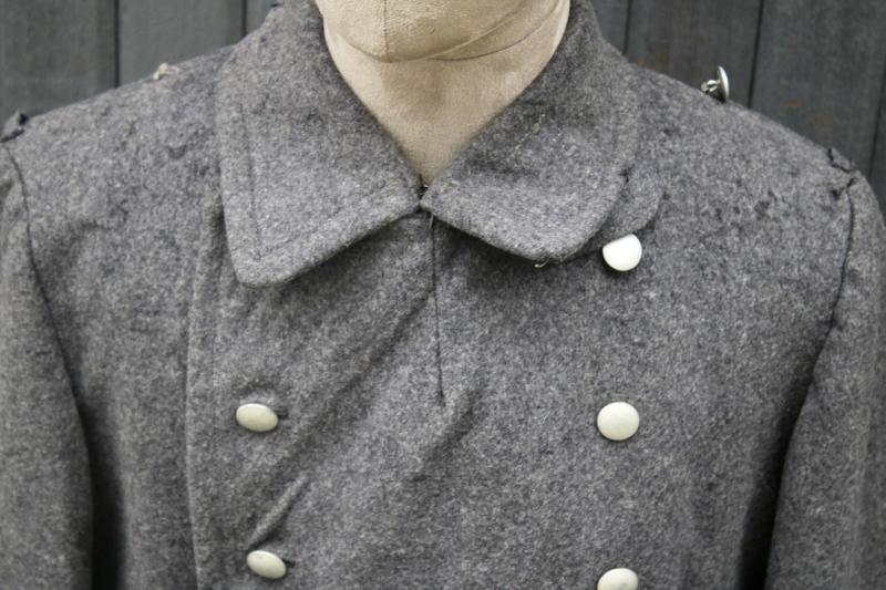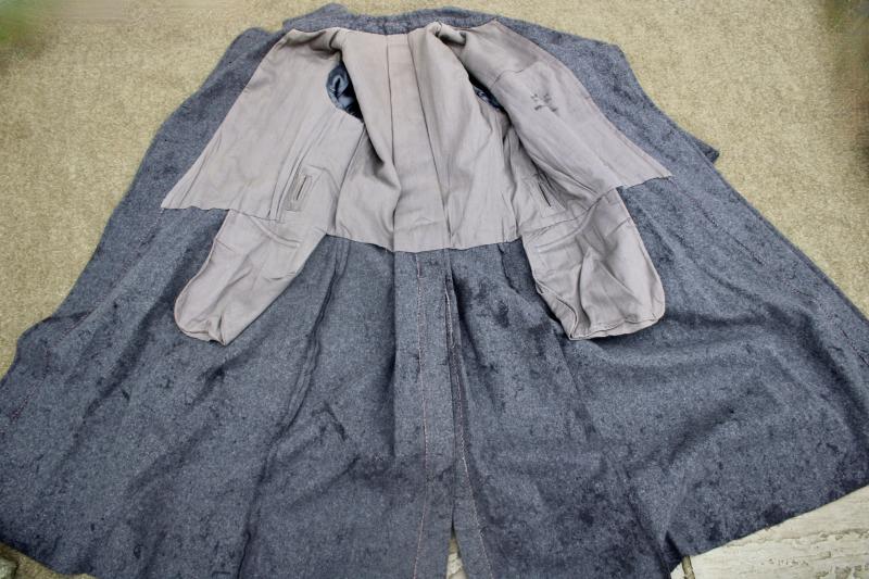 This is an enlisted man's great coat, which has externally suffered with moth tracking and minor moth holes. The lining is stamped with the usual size stamping is is maker marked "Wilhelm Schwar". One epaulette button is missing, however there is spare button in the pocket.