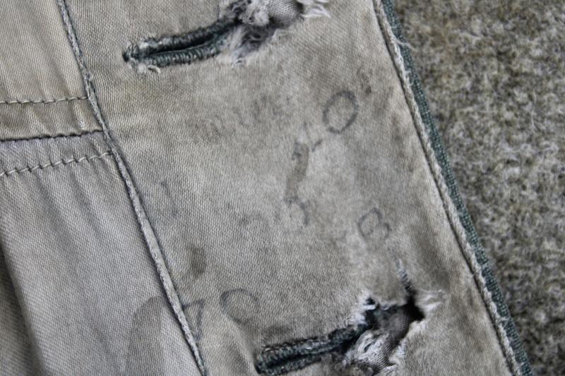 A M40 tunic which has suffered with some minor damage to the bottom of the rear of the tunic and some fraying to the two lower button holes. Otherwise the tunic is in good condition. The collar tabs and breast eagle have been re-applied and the tunic comes with a set of epaulettes which have the branch of service piping white for infantry. The lining has visible size markings. Still ideal for display and damage is not visible when a full set of field equipment is worn.