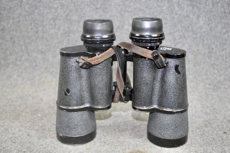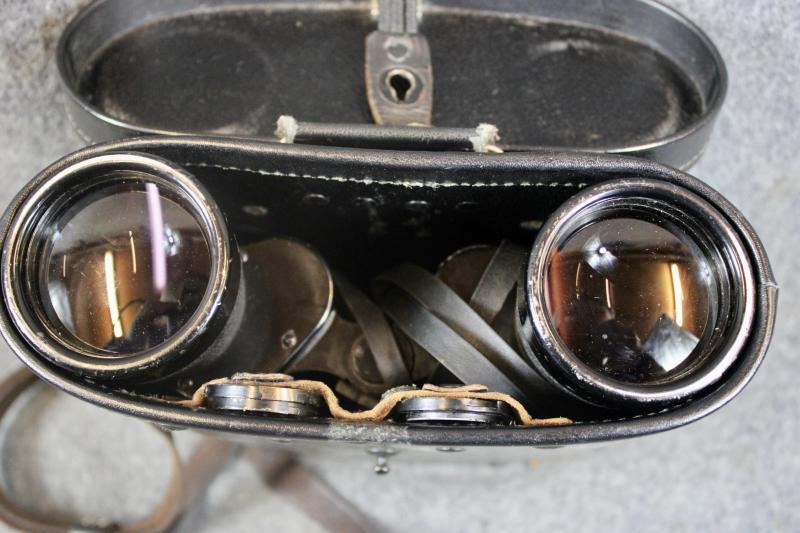 An extremely rare example of 7x50 gas mask binoculars which had two special extendable rubber eye-pieces which allowed the user, to use the binoculars while wearing a gas mask. When the eye-pieces where in its normal position, the binoculars can be used as a standard pair of binoculars. The gas-mask binoculars would come with two sets of coloured eye lenses filters. This example is in extremely nice condition with the rubber eye pieces still soft and supple. The optics are crystal clear with visible graticules. This example is marked with the three letter maker's code "blc" for Carl Ziess and come with their carrying case which is also marked "blc" for Carl Zeiss" The carrying case for Gas mask binoculars differ from the standard carrying case as they also carried two sets of coloured eye piece filters, which this example still retains. The case also has a nice clear Third Reich era proof marking ( Waffenampt ).