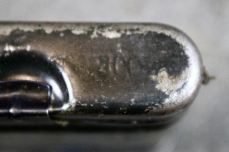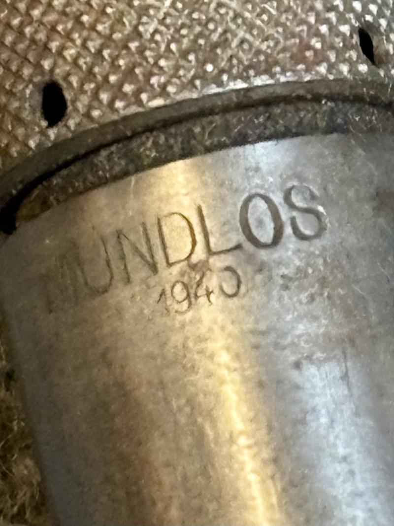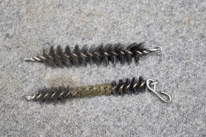 This is a complete K98 cleaning kit, which contains two brushes a chained linked metal pull-through, spoon and a 1940 dated oil bottle which is maker marked Mundlos. The container is painted in Luftwaffe blue.