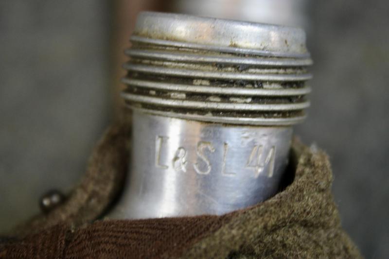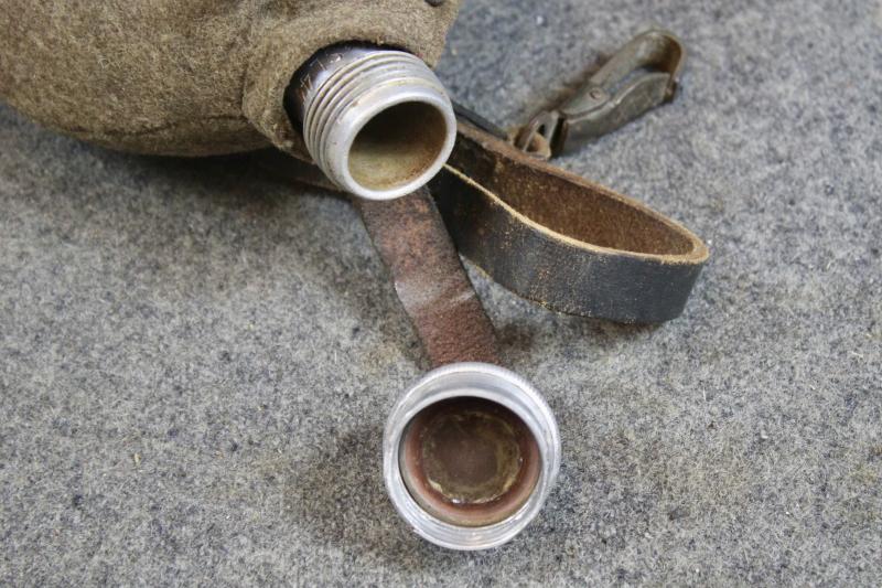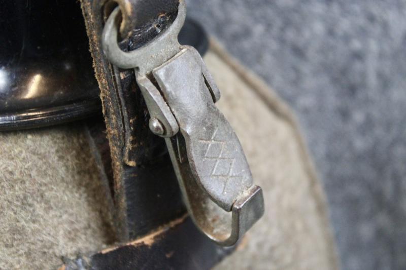 A nice example of an M31 water bottle, which is dated 1941 and comes with a bakelite drinking cup. The cap of the water botte, still contains rubber is and has the three letter makers code "HRE" for C.W.Motz & Co. The bottle is maker marked "L&SL", which identifies the maker as Thuringer Mobelfabrik.