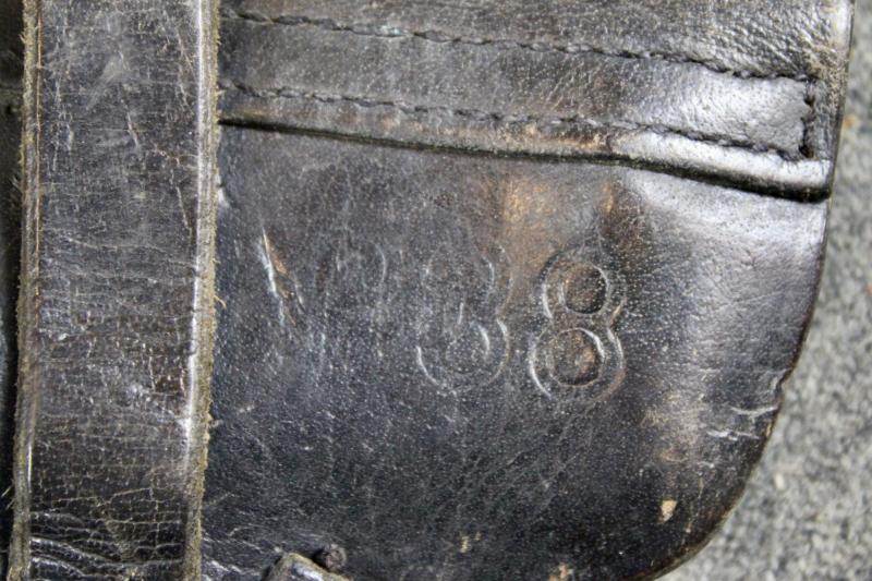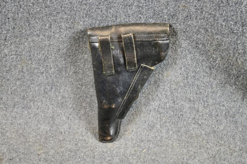 This is a very good example of a 1944 dated soft-shell holster for the P38 pistol. This example is maker marked "cxb" which identifies the maker as Moll Lederwarenfabrik.