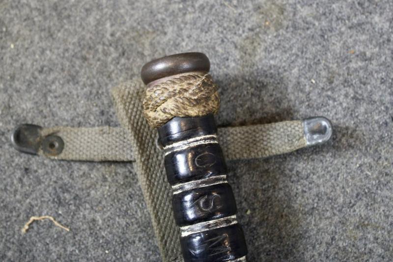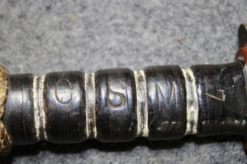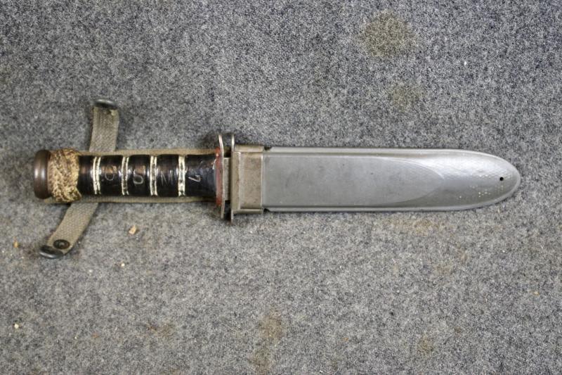 This is an extremely nice example of an RH-37 Fighting/Utility knife, which is very similar in design and function of the Ka-Bar. However the RH-37 was only issued to the Navy and where produced by Pal. The ricasso is also stamped 'Navy". They also have a red spacer on the pommel. However this example's red spacer is covered with wrapped string to give a better grip. The handle has also been personalised with the letters 'C.S.M" for Command Senior Chief Petty Officer with the number 7. This example also comes with a U.S. Navy MKII scabbard. This is an age restricted item. Proof of age must be provided. A photograph of your Drivers Licence or Passport is required before the item is sent. U.K. Sales Only.