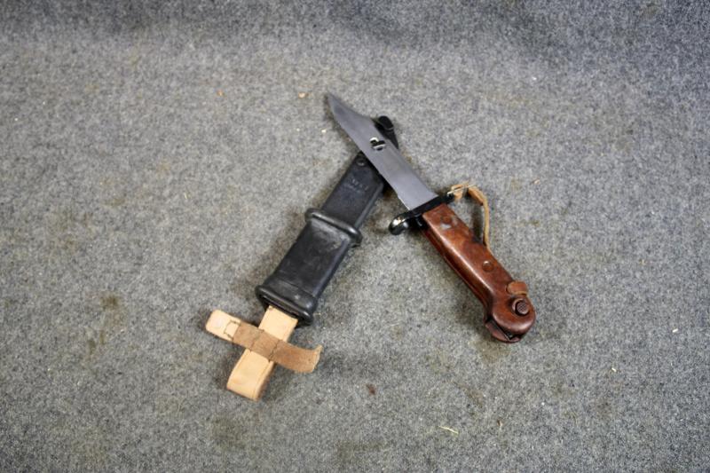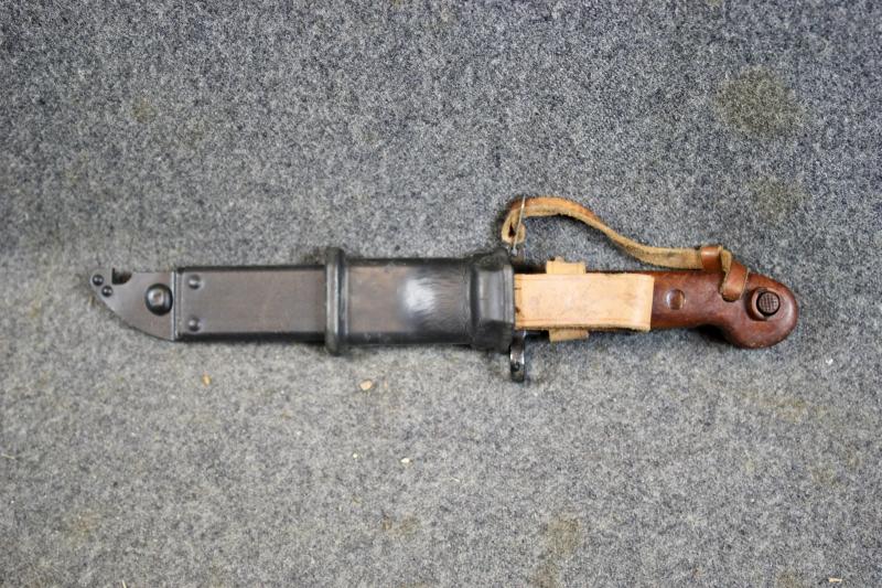 A Romanian made AKM bayonet with red grips. This is an age restricted item. Proof of age must be provided. A photograph of your Drivers Licence or Passport is required before the item is sent. U.K. Sales Only.