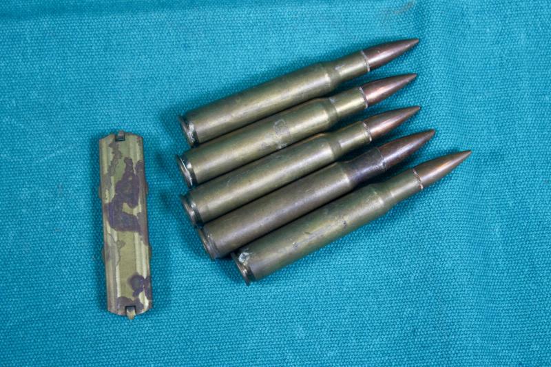 Five post-war U.S. made 30.06 rounds on a charger clip for the U.S. M1903 Springfield rifle. Springfield charger clips are extremely rare. We have a limited number in stock. U.K. Sales Only