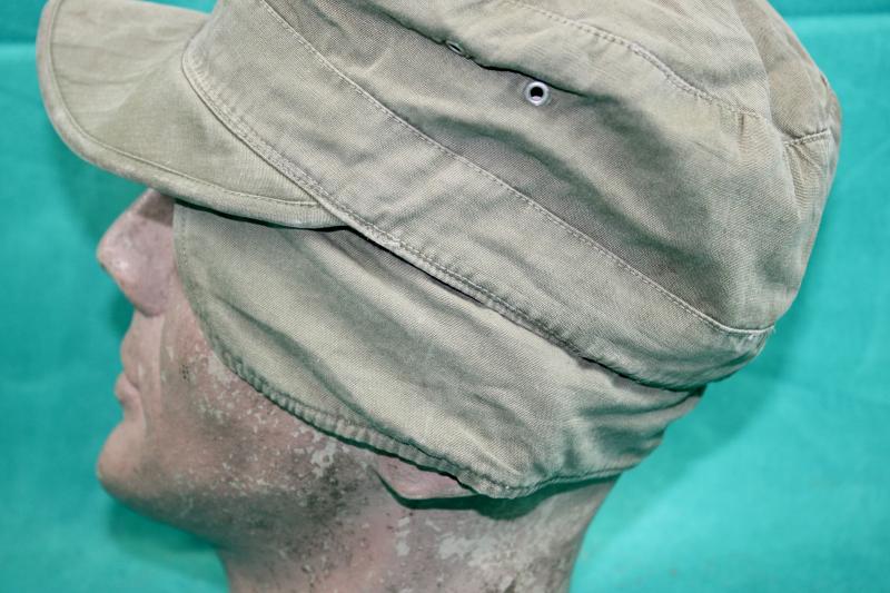 This M1943 field cap was part of the M1943 field uniform and was authorised in August 1943. The cap has a internal flannel-lined flap designed to cover the ears. The cap retains its contract label, however all the details have been washed out. The instruction label is still attached. The cap has the original owners personal service number and the flannel lining has suffered with a small tare. Later version of the M1943 field cap introduced in February 1945 have had the two side grommets deleted.