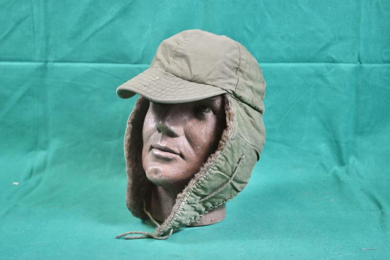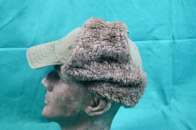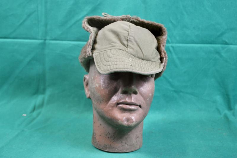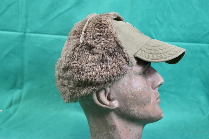 This is a pile lined winter field cap, which was an extremely popular item in the winter of 1944/45 and was highly sort after by vehicle drivers. This example is in good condition retaining it's instruction and contract labels. The details on both are faint and partially visible and is size stamped 7.