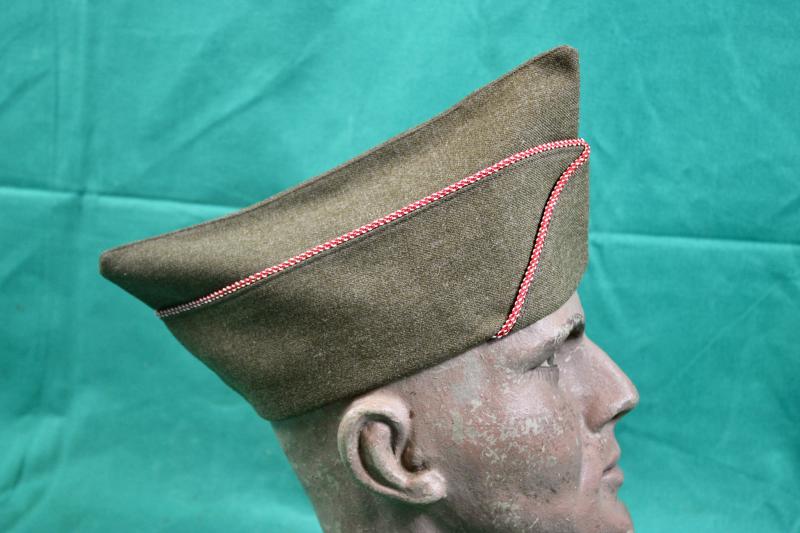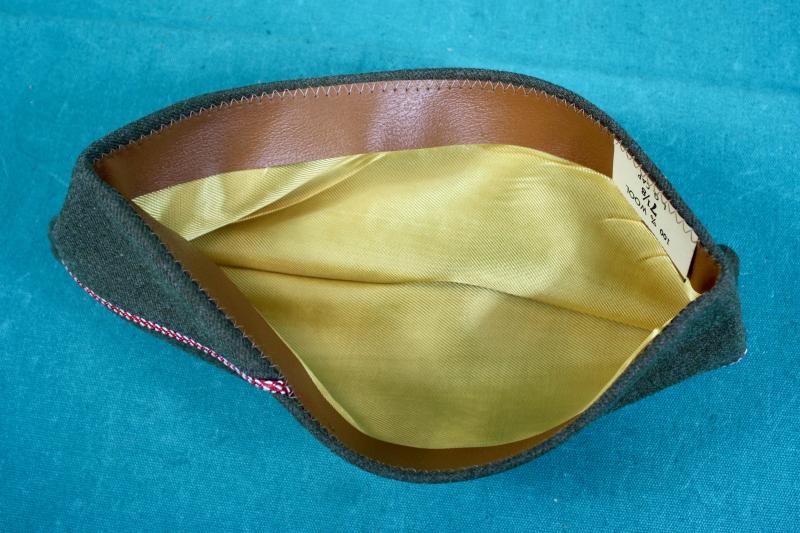 A army garrison cap which has the branch of service piping red and white for the Corps of Engineers. This example is unissued and retains its label, which gives the size 7.1/8 and the makers name L.G.Cap.