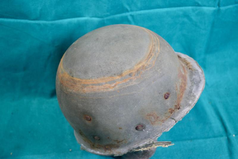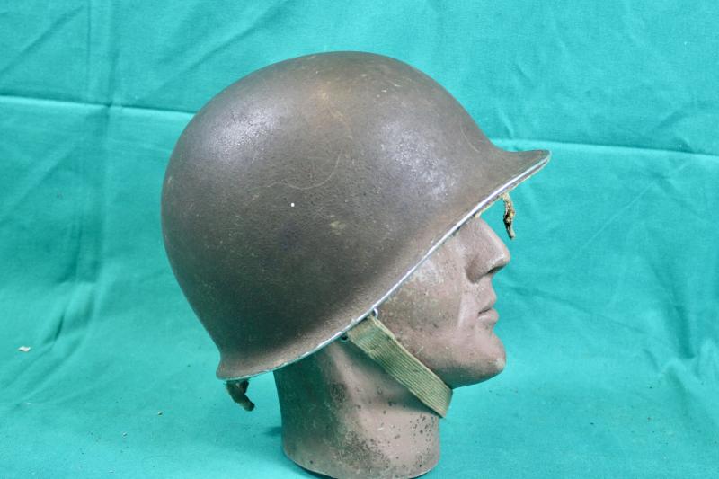 A nice example of a a M1 fixed bale helmet, which would have been produced between July 1941 to October 1943. This example retains its original finish, webbing chinstrap with early blackened brass buckle with raised features. The helmet comes with the early 1st pattern liner more commonly known as the Hawley liner. The outer edges has suffered with some fraying and the suspension straps have torn but are present including the liner's chinstrap which the leather has dried. The primary manufacturers of the first pattern liners was the McCord Radiator and Manufacturing Company, who subcontracted the production of the liners to the Hawley Products Company which lend to the nick name of the liners to Hawley liners. The inside of the shell has a visible heat number.