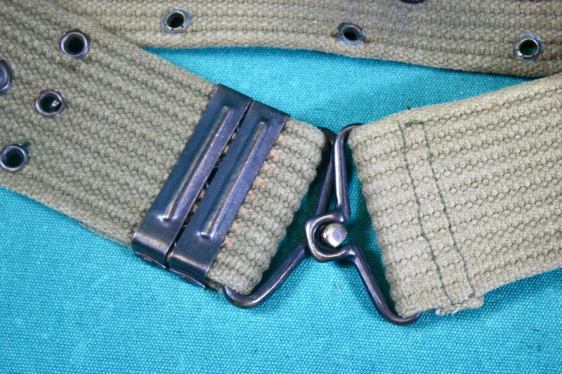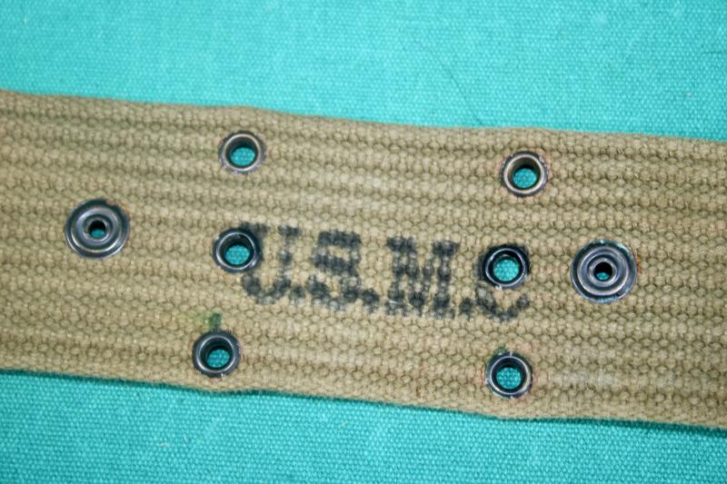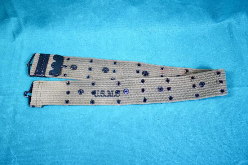 This the rarer Marine Corps M1961 pistol belt which has a row of fasteners allowing additional M14 and M1911 magazine pouches to be attached. The belt measures 36 inches.