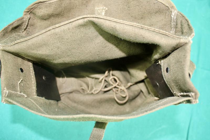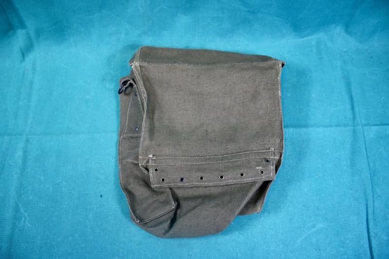 This is a late war medics pouch which is in Olive Drab 7.Two pouches could be worn on special medics suspenders or as a single pouch on a litter strap. The pouch has two canvas strips with grommets on each side which could be laced together to make the pouch smaller. The lace is still inside the pouch, which is an unissued item.