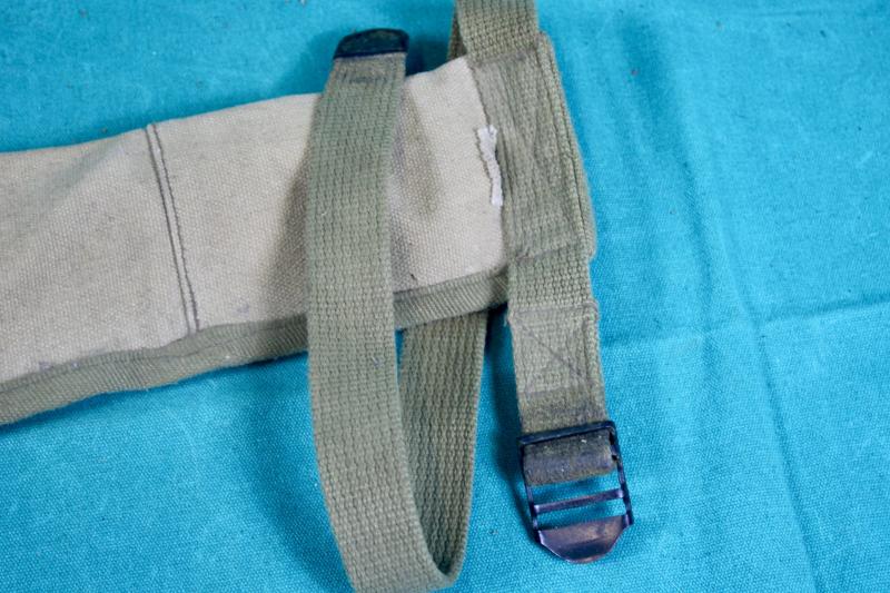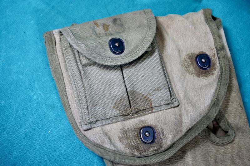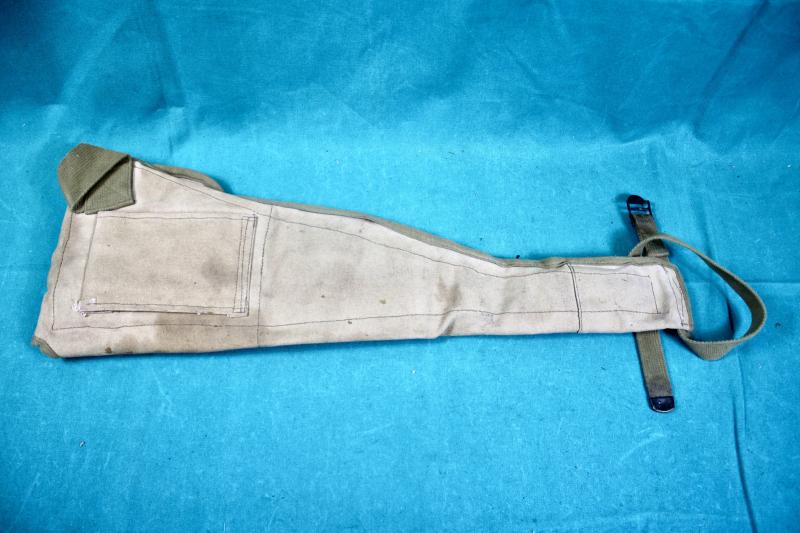 This is a special holster for the folding stock M1C carbine for use with paratroopers, which was adopted in February 1943. This example was been period modified with the addition of two M1 carbine twin magazine pouches which have been stitched to the holster. The holster is maker marked "Atlas Awning" and dated 1943.