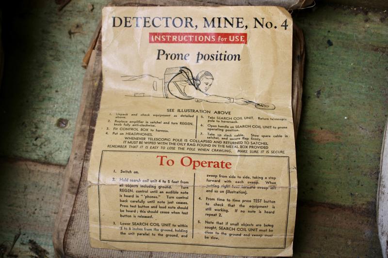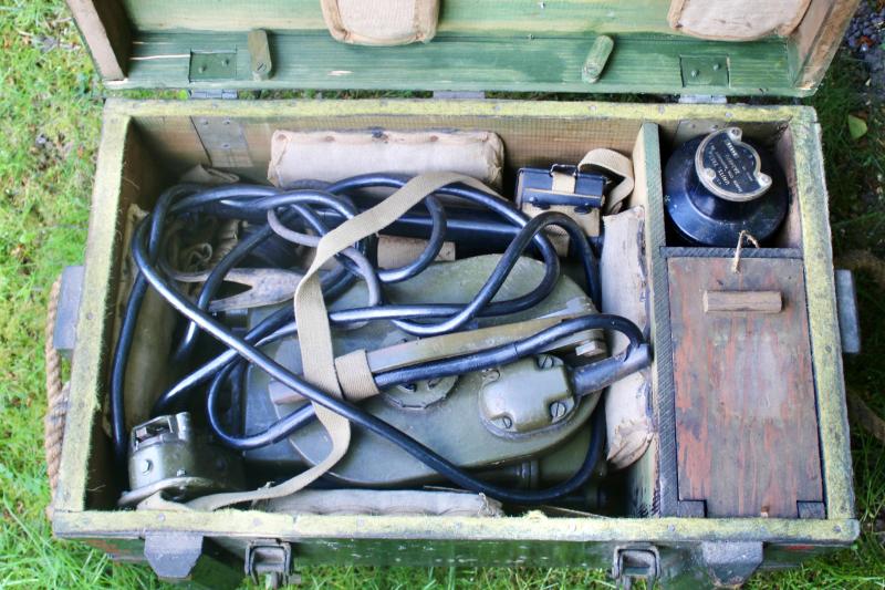 This is a MK4 mine detector was introduced in 1943 and was developed by a Polish army officer Lieutenant Jozef Kozacki. The MK4 mine detector remained in British service with upgraded versions the No4C remaining in service to the mind 1990's. This example is in excellent condition and has a service dated of March 1950. It comes with its transit box, testing unit, instruction manual and a 1944 dated haversack.